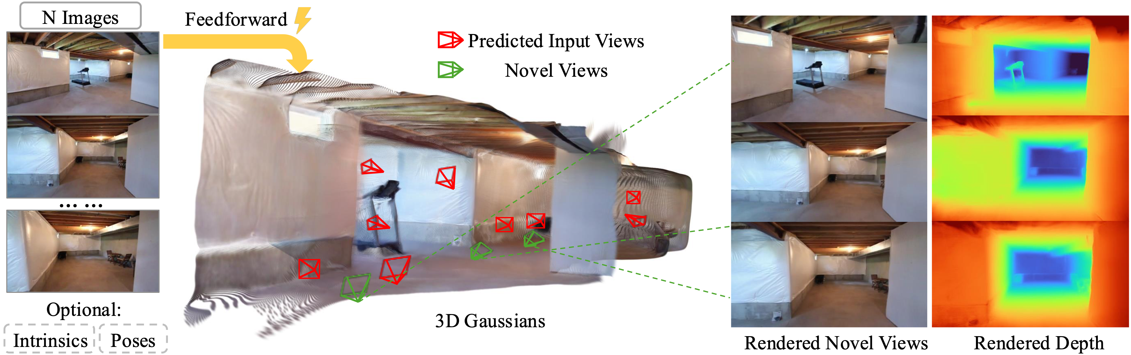 YoNoSplat reconstructs 3D Gaussian splats directly from unposed and uncalibrated images, while flexibly leveraging ground-truth camera poses or intrinsics when available.
